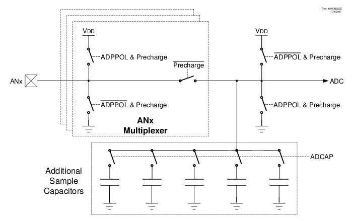 The ADC module contains several features that allow the user to perform a relative capacitance measurement on any ADC channel using the internal ADC sample and hold capacitance as a reference. This relative capacitance measurement can be used to implement capacitive touch or proximity sensing applications. The following figure shows the basic block diagram of the CVD portion of the ADC module.