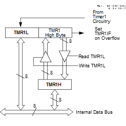 To accomplish this function, the TMRxH register value is mapped to a buffer register called the TMRxH buffer register. While in 16-Bit mode, the TMRxH register is not directly readable or writable and all read and write operations take place through the use of this TMRxH buffer register.