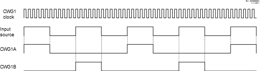 The push-pull sequencer is reset whenever EN = 0 or if an auto-shutdown event occurs. The sequencer is clocked by the first input pulse, and the first output appears on CWG1A.