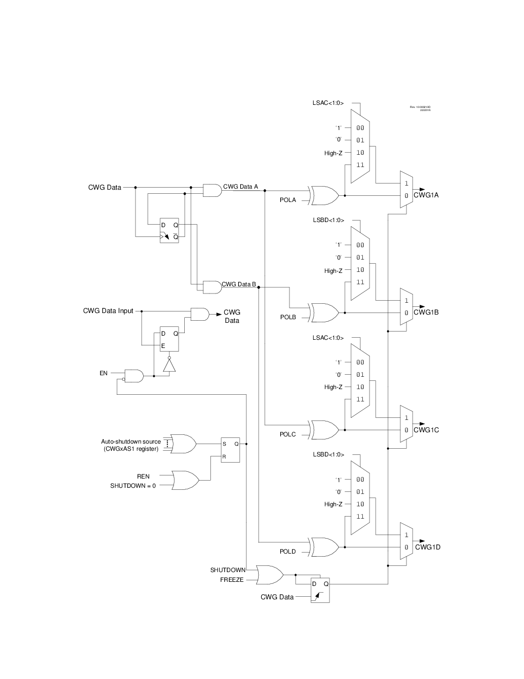 The unused outputs CWGxC and CWGxD drive copies of CWGxA and CWGxB, respectively, but with polarity controlled by the POLC and POLD bits of the CWGxCON1 register, respectively.