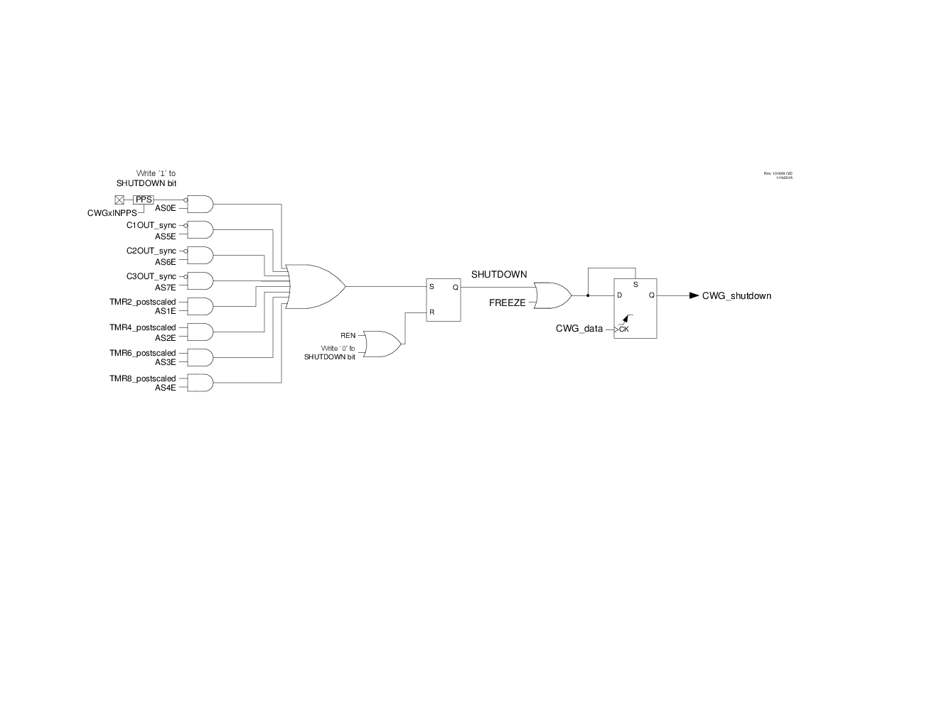 Auto-shutdown is a method to immediately override the CWG output levels with specific overrides that allow for safe shutdown of the circuit. The shutdown state can be either cleared automatically or held until cleared by software. The auto-shutdown circuit is illustrated in the following figure.