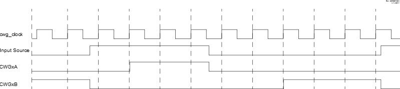 In Half-Bridge mode, the rising edge dead band delays the turn-on of the CWGxA output after the rising edge of the CWG data input. In Full-Bridge mode, the reverse dead-band delay is only inserted when changing directions from Forward mode to Reverse mode, and only the modulated output CWGxB is affected.
