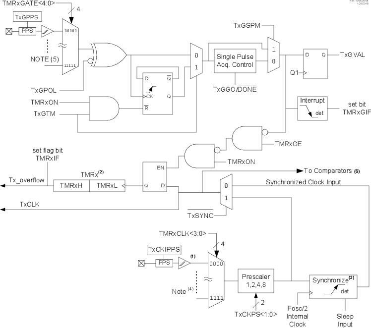 - 16-bit timer/counter register pair (TMRxH:TMRxL)