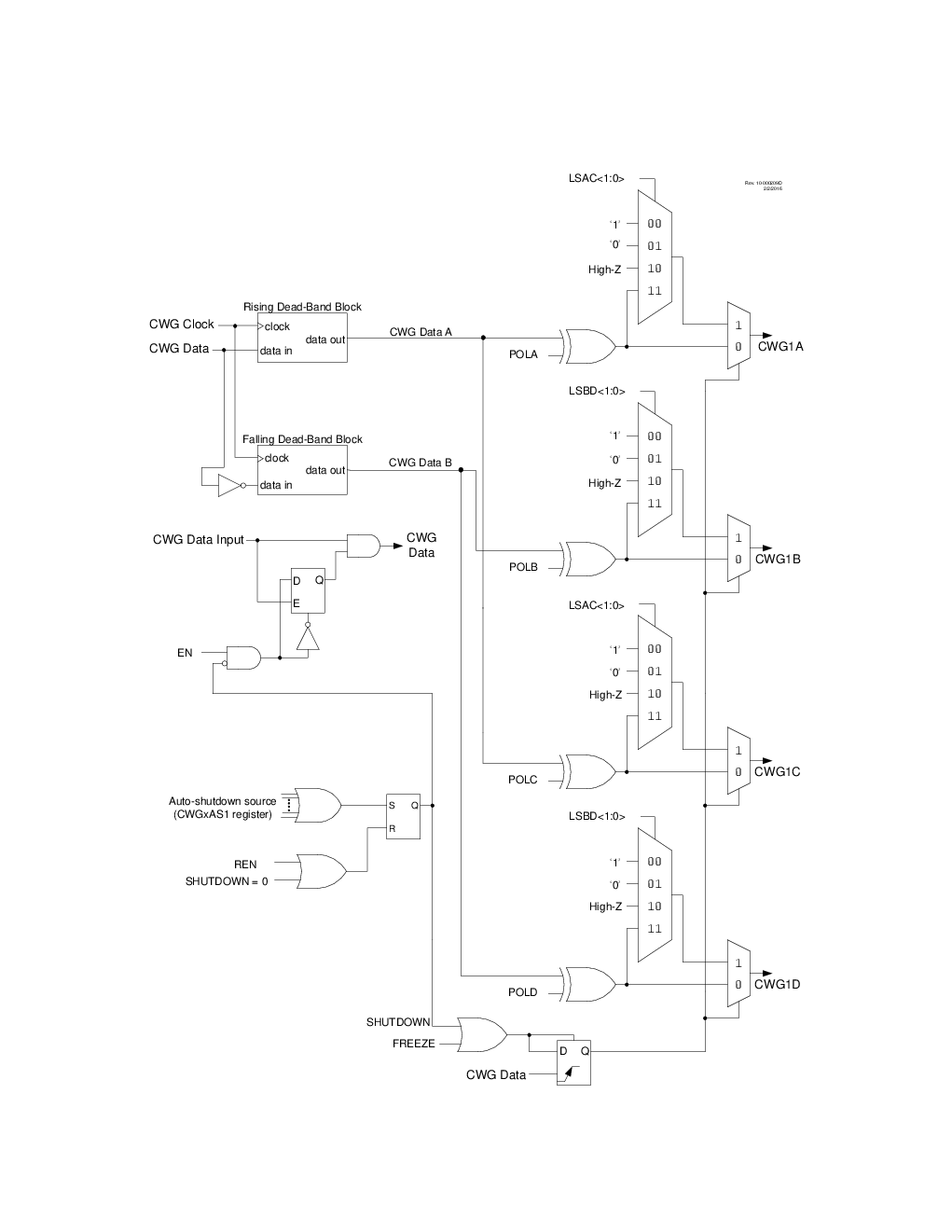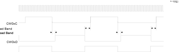 The unused outputs CWGxC and CWGxD drive similar signals, with polarity independently controlled by the POLC and POLD bits, respectively.