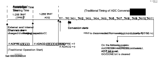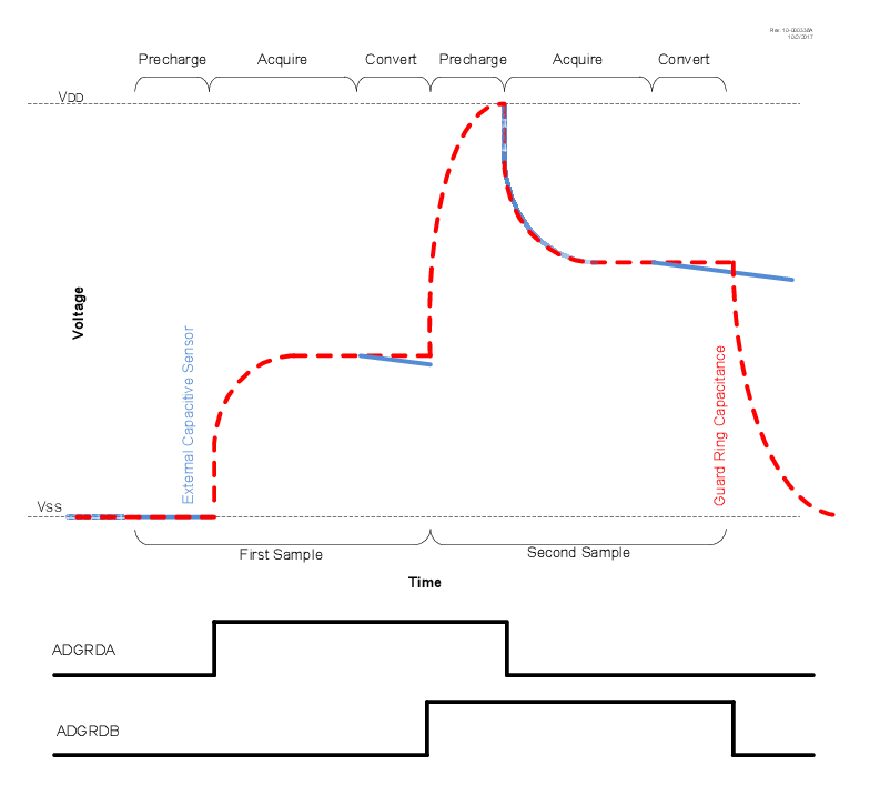At the start of the first precharge stage, both outputs are set to match the ADGPOL bit. Once the acquisition stage begins, ADGRDA changes polarity, while ADGRDB remains unchanged. When performing a double sample conversion, setting the ADIPEN bit causes both guard ring outputs to transition to the opposite polarity of ADGPOL at the start of the second precharge stage, and ADGRDA toggles again for the second acquisition. For more information on the timing of the guard ring output, refer to Figure 1 and Figure 2.