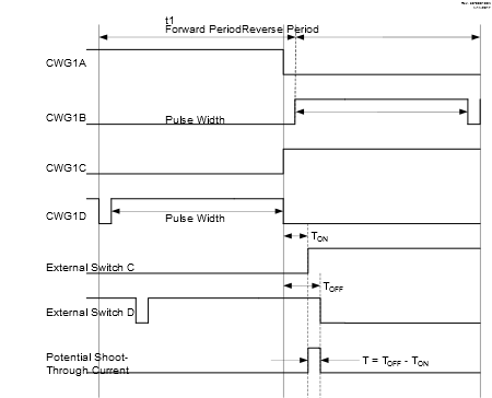 The following figure shows an example of the CWG outputs changing directions from forward to reverse, at near 100% duty cycle. In this example, at time t1, the output of CWGxA and CWGxD become inactive, while output CWGxC becomes active. Since the turn-off time of the power devices is longer than the turn-on time, a shoot-through current will flow through power devices QC and QD for the duration of âtâ. The same phenomenon will occur to power devices QA and QB for the CWG direction change from reverse to forward.