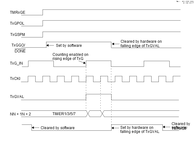 When Timer1 Gate Single-Pulse mode is enabled, it is possible to capture a single-pulse gate event. Timer1 Gate Single-Pulse mode is first enabled by setting the GSPM bit. Next, the GGO/DONE bit must be set. The Timer1 will be fully enabled on the next incrementing edge. On the next trailing edge of the pulse, the GGO/DONE bit will automatically be cleared. No other gate events will be allowed to increment Timer1 until the GGO/DONE bit is once again set in software.