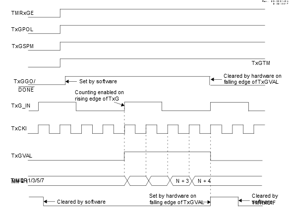 Enabling the Toggle mode and the Single-Pulse mode simultaneously will permit both sections to work together. This allows the cycle times on the Timer1 gate source to be measured. See figure below for timing details.