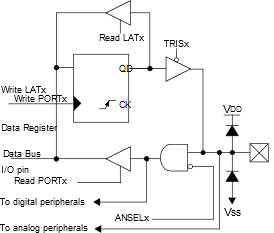 Disabling the input buffer prevents analog signal levels on the pin between a logic high and low from causing excessive current in the logic input circuitry. A simplified model of a generic I/O port, without the interfaces to other peripherals, is shown in the following figure