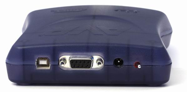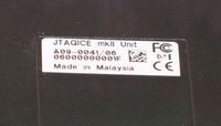 The rear panel of the Atmel AVR JTAGICE mkII houses the DC jack, power switch, USB, and RS-232 connectors.