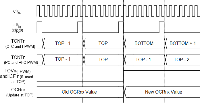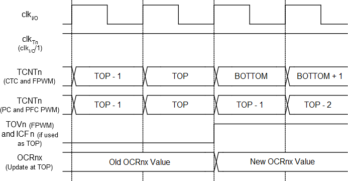 close to TOP in various modes. When using phase and frequency correct PWM mode the OCRnx Register is updated at BOTTOM. The timing diagrams will be