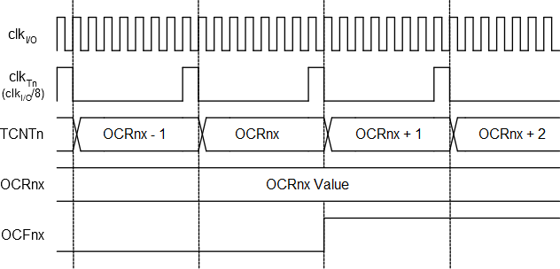 Setting of OCFnx, with Prescaler (fclk_I/O/8)