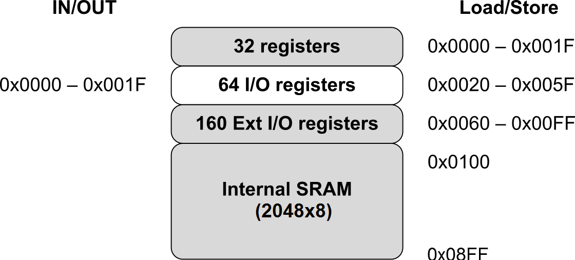 The lower 4352 data memory locations address both the Register File, the I/O memory, Extended I/O memory, and the internal data SRAM. The first 32 locations address the Register File, the next 64 location the standard I/O memory, then 160 locations of Extended I/O memory, and the next 4096 locations address the internal data SRAM.