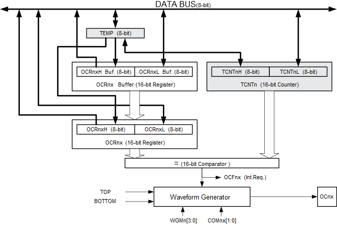 The 16-bit comparator continuously compares TCNTn with the Output Compare Register (OCRnx). If TCNT equals OCRnx the comparator signals a match. A match will set the Output Compare Flag (TIFRn.OCFx) at the next timer clock cycle. If enabled (TIMSKn.OCIEx = 1), the Output Compare Flag generates an Output Compare interrupt. The OCFx Flag is automatically cleared when the interrupt is executed. Alternatively the OCFx Flag can be cleared by software by writing a logical one to its I/O bit location. The Waveform Generator uses the match signal to generate an output according to operating mode set by the Waveform Generation mode (WGMn[3:0]) bits and Compare Output mode (COMnx[1:0]) bits. The TOP and BOTTOM signals are used by the Waveform Generator for handling the special cases of the extreme values in some modes of operation, see Modes of Operation.
