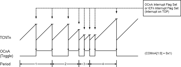 An interrupt can be generated at each time the counter value reaches the TOP value by either using the OCFnA or ICFn Flag, depending on the actual CTC mode. If the interrupt is enabled, the interrupt handler routine can be used for updating the TOP value.