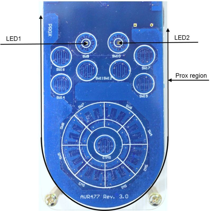 AVR477 remote would go to sleep state if the QTouch keys are inactive for more than 10 minutes. When it is in active state, both LED1 and LED2 will be in ON state. When it is in sleep state both LED1 and LED2 will be turned OFF. It can be woken up by moving your hand away from the Prox region (indicated in the Figure 1) and bringing your hand again close to the Prox region of the AVR477 remote. When it wakes up from sleep, it will take ~1 sec for BitCloud® SW stack to initialize and after initialization LED1 and LED2 will be turned ON.