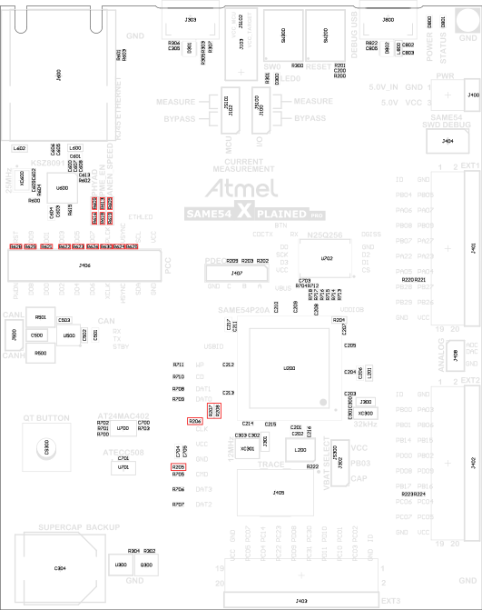 SAM E54 Xplained Pro has several resistors that can be used to disconnect I/O pins of the ATSAME54P20A from connectors and on-board ICs, and to disconnect power signals.