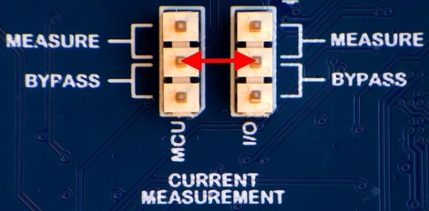 on-board 3-pin current measurement headers (J100 and J102), and connect the two