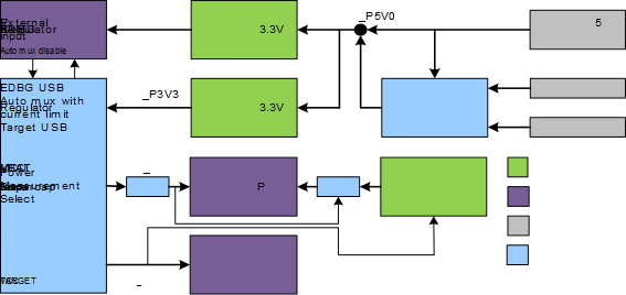 SAM E54 Xplained Pro has three power sources: EDBG USB, Target USB, and/or external 5.0V. The kit will automatically select a source to draw power from. The kit has two on-board 3.3V voltage regulators, one for the EDBG and XAM, and one for the ATSAME54P20A and other peripherals.