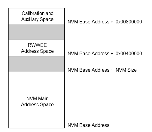 The NVM block contains a calibration and auxiliary space plus a dedicated EEPROM emulation space that are memory mapped. Refer to the NVM Organization figure below for details.