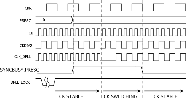 The DPLL controller includes an output prescaler. This prescaler provides three selectable output clocks CK, CKDIV2 and CKDIV4. The Prescaler bit field in the DPLL Prescaler register (DPLLPRESC.PRESC) is used to select a new output clock prescaler. When the prescaler field is modified, the DPLLSYNCBUSY.DPLLPRESC bit is set. It will be cleared by hardware when the synchronization is over.