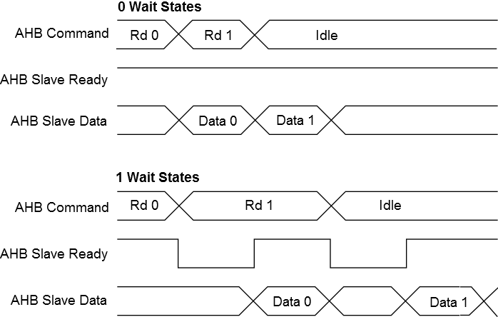 The number of cycles data are delayed to the AHB bus is determined by the read wait states. Examples of using zero and one wait states are shown in Figure Read Wait State Examples below.