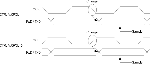 The Clock Polarity bit in the Control A register (CTRLA.CPOL) selects which XCK clock edge is used for RxD sampling, and which is used for TxD change: