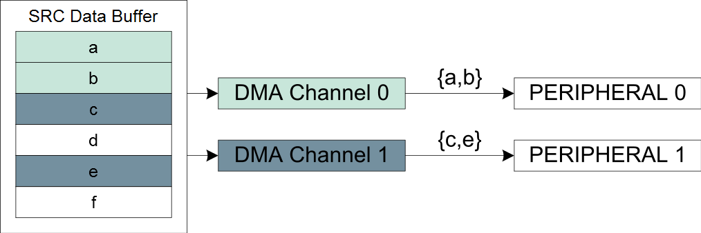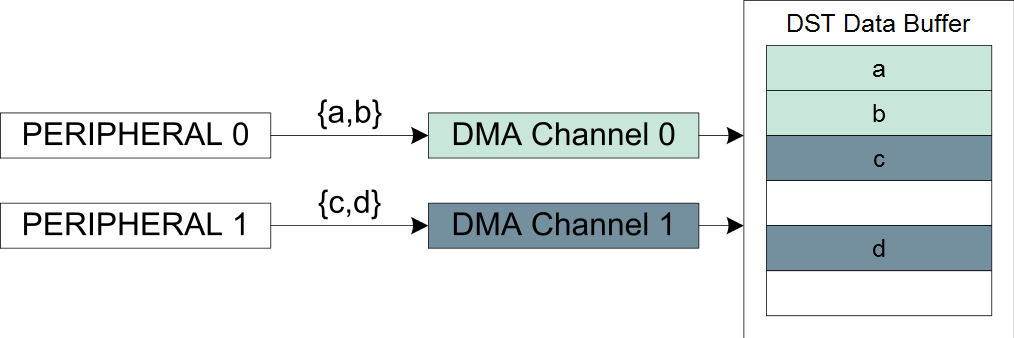 Figure 2shows an example where DMA channel 0 is configured to increment destination address by one beat (BTCTRL.DSTINC=1) and DMA channel 1 is configured to increment destination address by two beats (BTCTRL.DSTINC=1, BTCTRL.STEPSEL=0, and BTCTRL.STEPSIZE=0x1). As the source address for both channels are peripherals, source incrementation is disabled (BTCTRL.SRCINC=0).