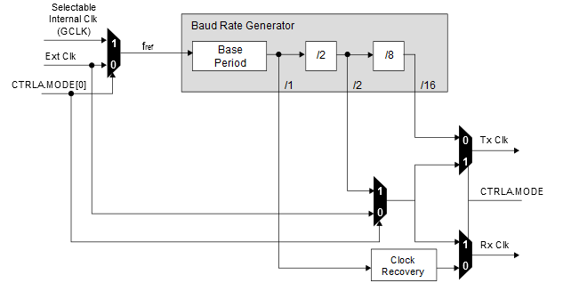 For asynchronous communication, the /16 (divide-by-16) output is used when transmitting, whereas the /1 (divide-by-1) output is used while receiving.