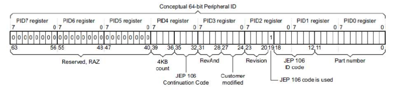 | 4KB count | 4 | Indicates that the CoreSight component is a ROM: 0x0 | PID4 |