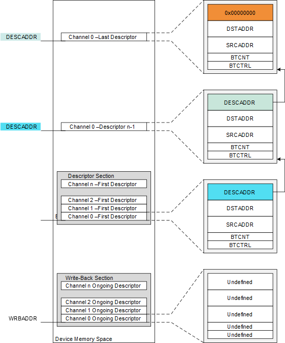 The write-back memory section is the section where the DMAC stores the transfer descriptors for the ongoing block transfers. WRBADDR points to the ongoing transfer descriptor of channel 0. All ongoing transfer descriptors will be stored in a contiguous memory section where the transfer descriptors are ordered according to their channel number. The figure below shows an example of linked descriptors on DMA channel 0. For further details on linked descriptors, refer to Linked Descriptors.