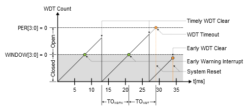 In Window mode operation, the WDT uses two different time specifications: the WDT can only be cleared by writing 0xA5 to the CLEAR register after the closed window time-out period (TOWDTW), during the subsequent Normal time-out period (TOWDT). If the WDT is cleared before the time window opens (before TOWDTW is over), the WDT will issue a system reset.