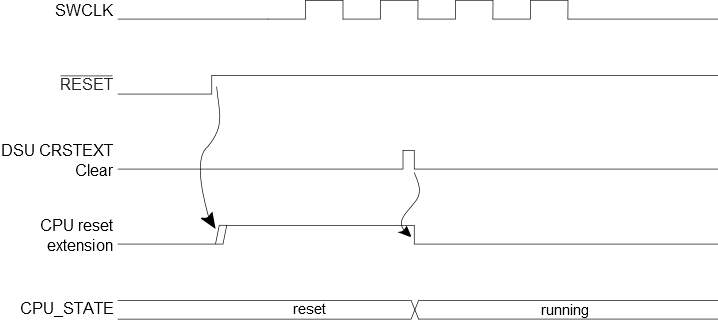 “CPU reset extension” refers to the extension of the reset phase of the CPU core after the external reset is released. This ensures that the CPU is not executing code at startup while a debugger connects to the system. It is detected on a RESET release event when SWCLK is low. At startup, SWCLK is internally pulled up to avoid false detection of a debugger if SWCLK is left unconnected. When the CPU is held in the reset extension phase, the CPU Reset Extension bit of the Status A register (STATUSA.CRSTEXT) is set. To release the CPU, write a '1' to STATUSA.CRSTEXT. STATUSA.CRSTEXT will then be set to zero. Writing a '0' to STATUSA.CRSTEXT has no effect. For security reasons, it is not possible to release the CPU reset extension when the device is protected by the NVMCTRL security bit. Trying to do so sets the Protection Error bit (PERR) of the Status A register (STATUSA.PERR).