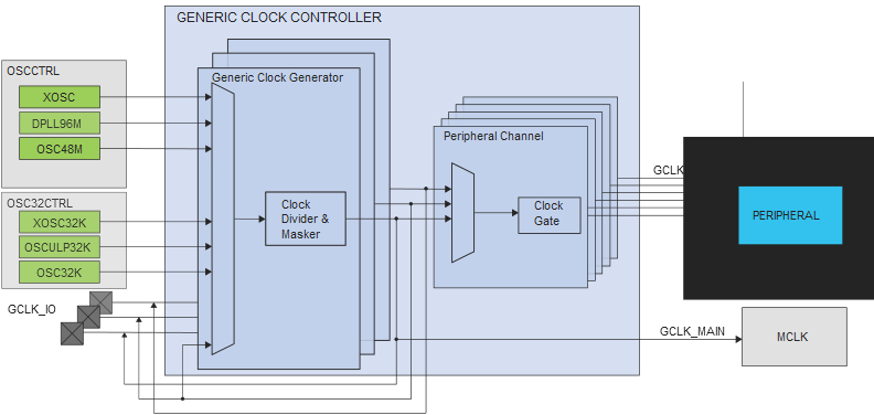 The generation of Peripheral Clock signals (GCLK_PERIPH) and the Main Clock (GCLK_MAIN) can be seen in Device Clocking Diagram.
