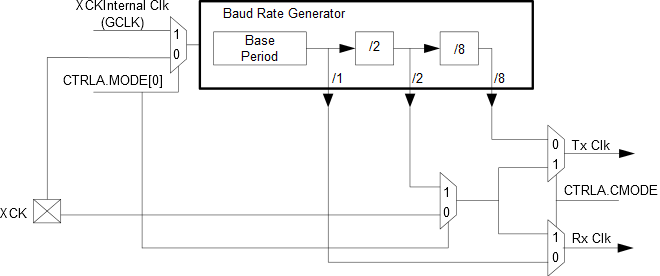 For both synchronous and asynchronous modes, the clock used for shifting and sampling data can be generated internally by the SERCOM baud-rate generator or supplied externally through the XCK line.
