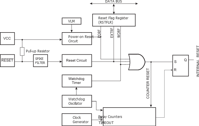 After all reset sources have gone inactive, a delay counter is invoked, stretching the internal reset. This allows the power to reach a stable level before normal operation starts.