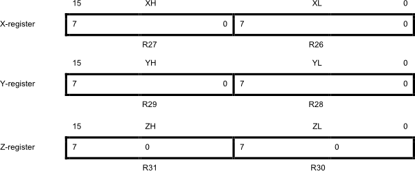 The registers R26...R31 have some added functions to their general purpose usage. These registers are 16-bit address pointers for indirect addressing of the data space. The three indirect address registers X, Y, and Z are defined as described in the figure.