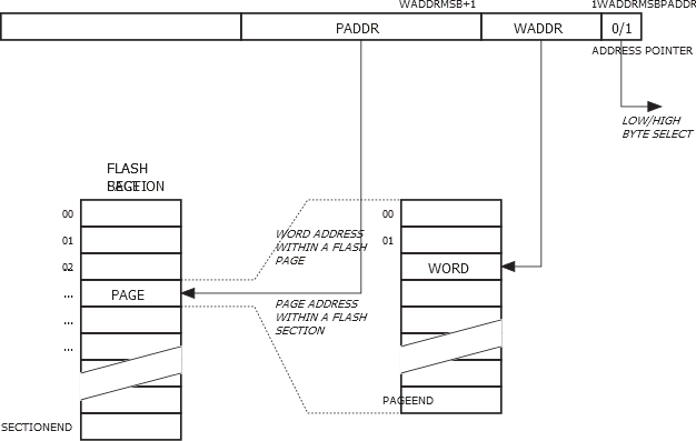 The most significant bits of the data space address select the NVM Lock bits or the Flash section mapped to the data memory. The word address within a page (WADDR) is held by bits [WADDRMSB:1], and the page address (PADDR) by bits [PADDRMSB:WADDRMSB+1]. Together, PADDR and WADDR form the absolute address of a word in the Flash section.