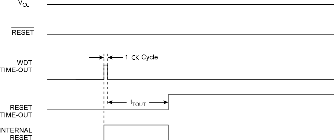 When the Watchdog times out, it will generate a short reset pulse of one CK cycle duration. On the falling edge of this pulse, the delay timer starts counting the Time-out period tTOUT.