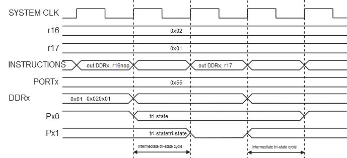 In Break-Before-Make mode, switching the DDRxn bit from input to output introduces an immediate tri-state period lasting one system clock cycle, as indicated in the figure below. For example, if the system clock is 4 MHz and the DDRxn is written to make an output, an immediate tri-state period of 250 ns is introduced before the value of PORTxn is seen on the port pin.
