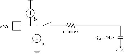 The analog input circuitry for single ended channels is illustrated below. An analog source applied to ADCn is subjected to the pin capacitance and input leakage of that pin, regardless of whether that channel is selected as input for the ADC. When the channel is selected, the source must drive the S/H capacitor through the series resistance (combined resistance in the input path).