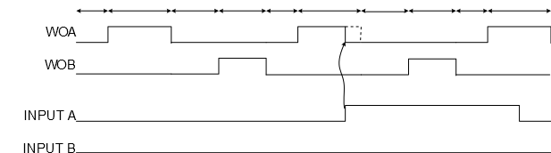 If Input mode 9 is used on input A and an positive input Event occurs while in On time A, the output will be off for the rest of the on-time.