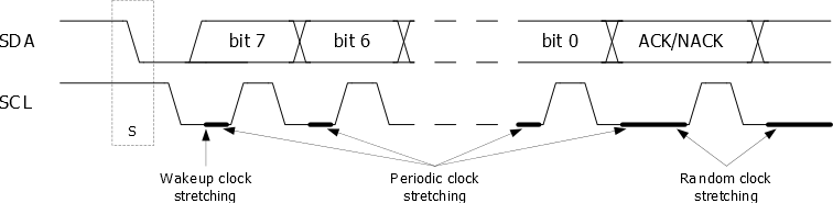 A slave device can slow down the bus frequency by stretching the clock periodically on a bit level. This allows the slave to run at a lower system clock frequency. However, the overall performance of the bus will be reduced accordingly. Both the master and slave device can randomly stretch the clock on a byte level basis before and after the ACK/NACK bit. This provides time to process incoming or prepare outgoing data, or perform other time-critical tasks.
