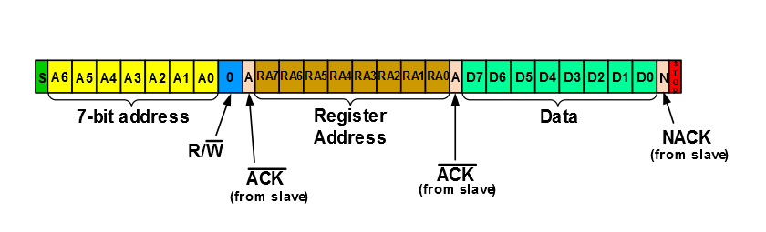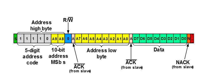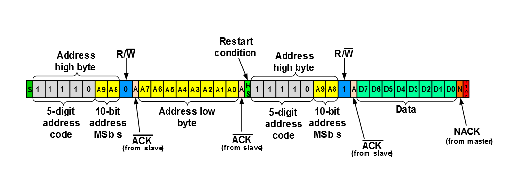 I2CxTXB. Writes to the Start bit (S) are ignored.In 7-bit Addressing mode, the Least Significant bit (LSb) of the 7-bit address byte acts as the Read/not Write (R/W) information bit, while in 10-bit Addressing mode, the LSb of the address high byte is reserved as the R/W bit. When R/W is set, the master intends to read data from the slave (see figure below). When R/W is clear, the master intends to write data to the slave (see figure below). The master may also wish to read or write data to a specific location, such as writing to a specific EEPROM location. In this case, the master issues a Start condition, followed by the slave’s address with the R/W bit clear. Once the slave acknowledges the address, the first data byte following the 7-bit or 10-bit address is used as the slave’s specific register location. If the master intends to read data from the specific location, it must issue a Restart condition, followed by the slave address with the R/W bit set (see figure below). If the addressed slave device exists on the bus, it must respond with an Acknowledge (ACK) sequence.
