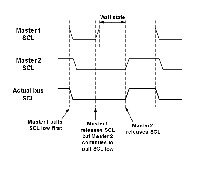 This means that when the clocks are synchronized, the SCL low period is determined by the master with the longest SCL low period, while the SCL high period is determined by the master device with the shortest SCL high period.