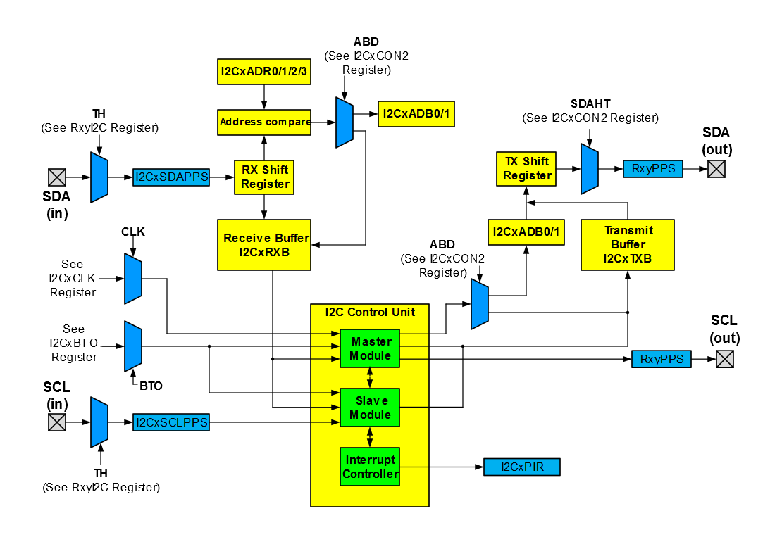 The following figure shows a block diagram of the I2C interface module, and shows both Master and Slave modes together.