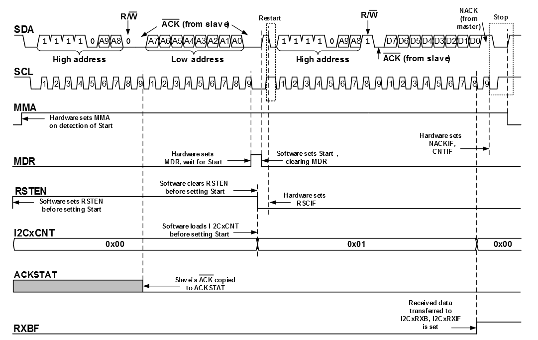 0). The address low byte is loaded into I2CxADB0 and the Restart Enable (RSEN) bit is set by software. After