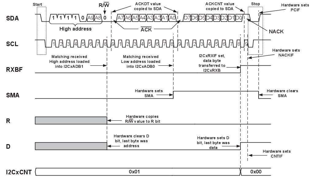 received low address byte is compared to the values in I2CxADR0 and I2CxADR2. In 10-bit Addressing with Masking
