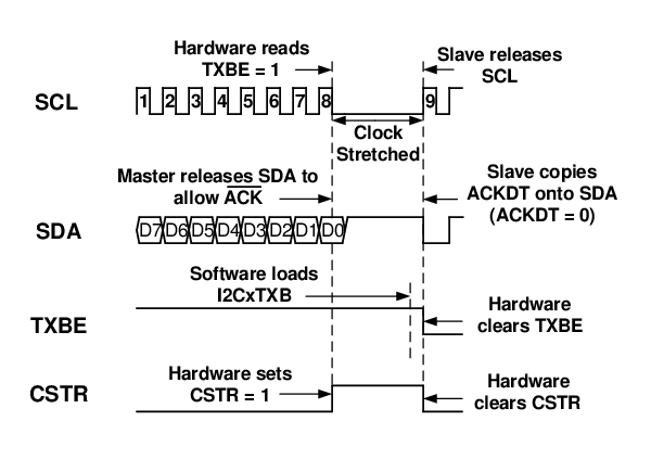 new data into I2CxTXB, slave hardware automatically clears CSTR to release the SCL line