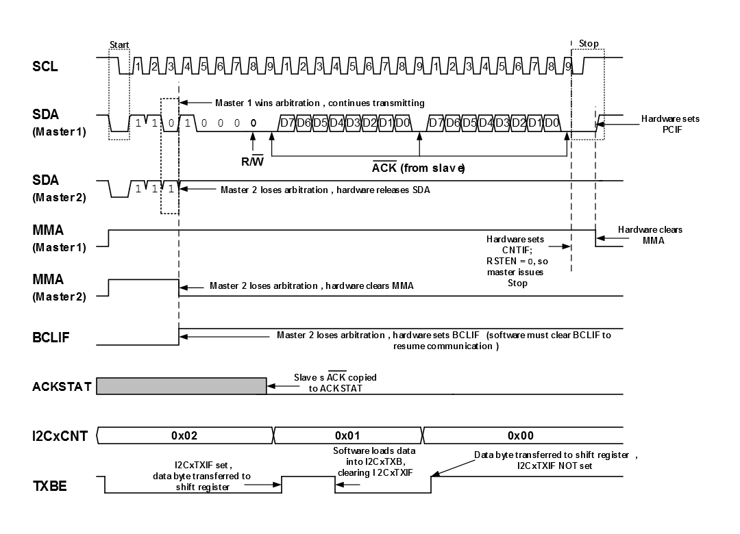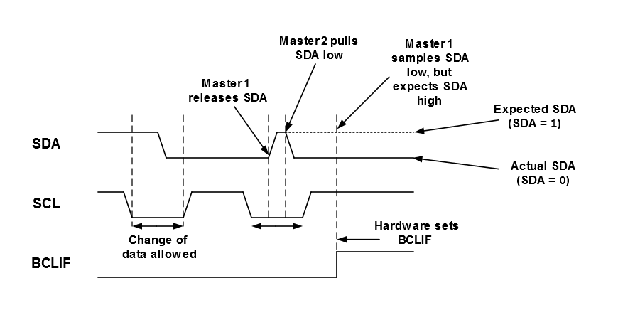 If a collision occurs during the data transfer phase, the transmission is halted and both SCL and SDA are released by hardware. If a collision occurs during a Start, Restart, Acknowledge, or Stop, the operation is aborted and hardware releases SCL and SDA. If a collision occurs during the addressing phase, the master that ‘wins’ arbitration may be attempting to address the ‘losing’ master as a slave. In this case, the master that lost arbitration must switch to its Slave mode and check to see if an address matches.